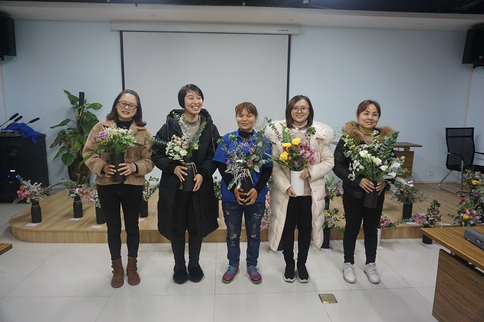 經過2個小時的培訓和親手實踐,在老師的精心指點下,一束束錯落有致、生機盎然的插花作品展現在了大家眼前,看著通過自己雙手制作成的插花作品,大家的臉上都洋溢著喜悅的笑容,紛紛用手機記錄下這精彩瞬間。活動最后,在徐珍老師和各位女同胞的評選下,出現了華數本年度五位“最佳花藝設計師”!