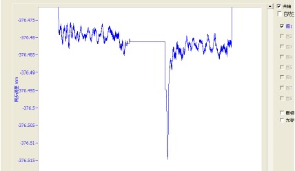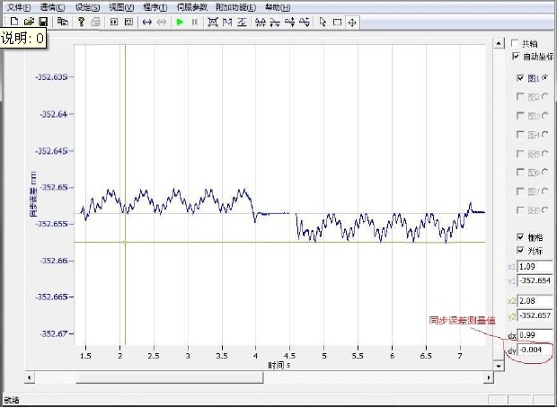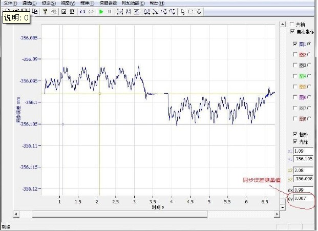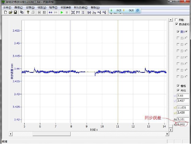?8) 單擊開始采樣(請確保此時NC正在運行剛性攻絲程序),得到剛性攻絲同步誤差圖如下: