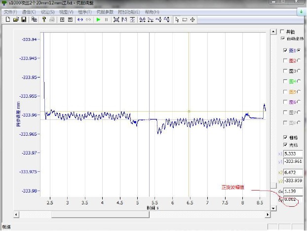 ????? 圖1及圖2中出現(xiàn)的正旋波為Z軸電機特性,與電機的極對數(shù)相關,電機每轉一圈產生極對數(shù)個正旋波,該正旋波的幅值也可通過加大速度比例增益減小。