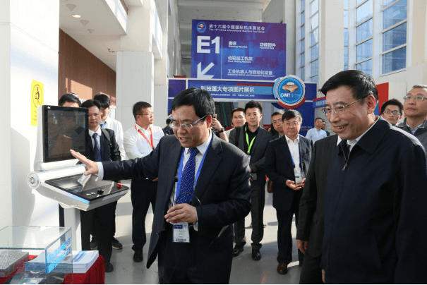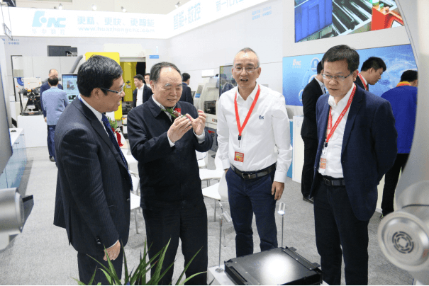 陳吉紅董事長向中國機械工業(yè)聯(lián)合會王瑞祥會長、中國機床工具工業(yè)協(xié)會常務(wù)副理事長毛予鋒、中國工程院原院長周濟院士等來訪貴賓介紹華中數(shù)控最新產(chǎn)品及技術(shù)