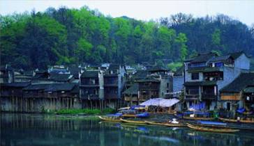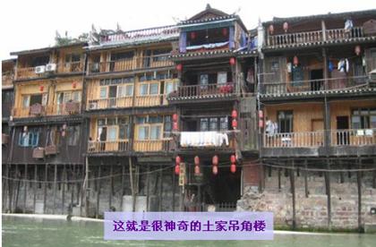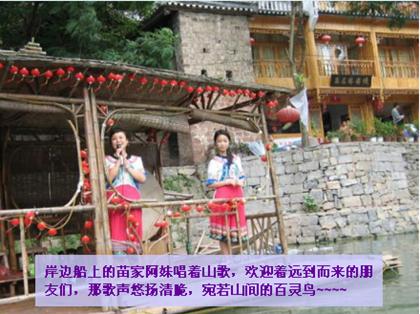 那湘人深諳經(jīng)商之道,怕我們泛舟枯燥影響雅興,居然在江中設(shè)一對(duì)歌臺(tái)于龍舟上。舟上眾多美女著民族服飾不斷唱山歌輪番“挑逗”游客,我們一激動(dòng)便讓船老板教我們和起了山歌。那時(shí)候什么斯文形象、什么旅途疲憊、什么時(shí)間觀念,哈哈!統(tǒng)統(tǒng)地拋在腦后。到得岸邊,一行人樂呵呵都說不虛此行!以至于回到故鄉(xiāng)N日了,鳳凰古城那碧綠的江水、江中暢游的漁舟、江畔吊腳樓的裊裊輕煙,以及兩岸浣紗山姑的朗朗笑聲,就像蒙太奇似地總是在腦海里不斷疊現(xiàn)……
