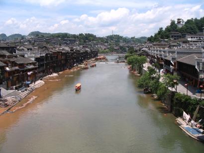 據(jù)導(dǎo)游介紹,在鳳凰城登高眺望,除古色古香的古建筑外,還可欣賞“鳳凰古八景”:東嶺迎暉、南華疊翠、奇峰挺秀、溪橋夜月、龍?zhí)稘O火、梵閣回濤、山寺晨鐘、蘭徑樵歌。近年新推出的“鳳凰新八景”,包括沙灣沈從文故居、東門城樓、北門碼頭、沱江泛舟、虹橋藝術(shù)樓、熊希齡故居、楊家祠堂、萬壽宮、崇德堂等如今也成為游客選擇的熱門的新旅游項(xiàng)目。我們一行人便迫不及待地參與泛舟沱水賞景。真是人在江湖身不由己,我們泛舟江中,經(jīng)不住誘惑,不經(jīng)意間進(jìn)入人家的“圈套”,實(shí)實(shí)在在地為其他游客做了一回“道具”一抹“風(fēng)景”。