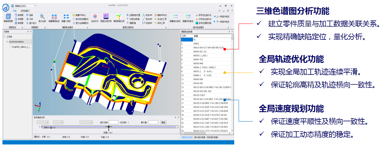 智優曲面(iSurfine)軟件是華中數控系統配套的曲面加工優化的專用軟件,具備加工數據色譜分析、全局軌跡平滑和速度橫向優化功能,助力系統實現高速高精加工,提升產品加工效率及表面質量。智優曲面—三維色譜分析功能iSurfi...