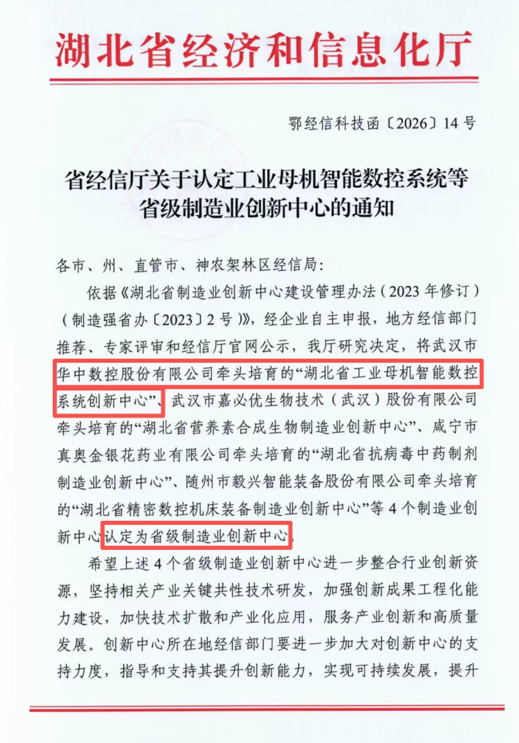 依據(jù)《湖北省制造業(yè)創(chuàng)新中心建設(shè)管理辦法(2023年修訂)(制造強(qiáng)省辦〔2023〕2號(hào))》,經(jīng)企業(yè)自主申報(bào),地方經(jīng)信部門推薦、專家評(píng)審和經(jīng)信廳官網(wǎng)公示,我廳研究決定,將武漢市華中數(shù)控股份有限公司牽頭培育的“湖北省工業(yè)母機(jī)智...